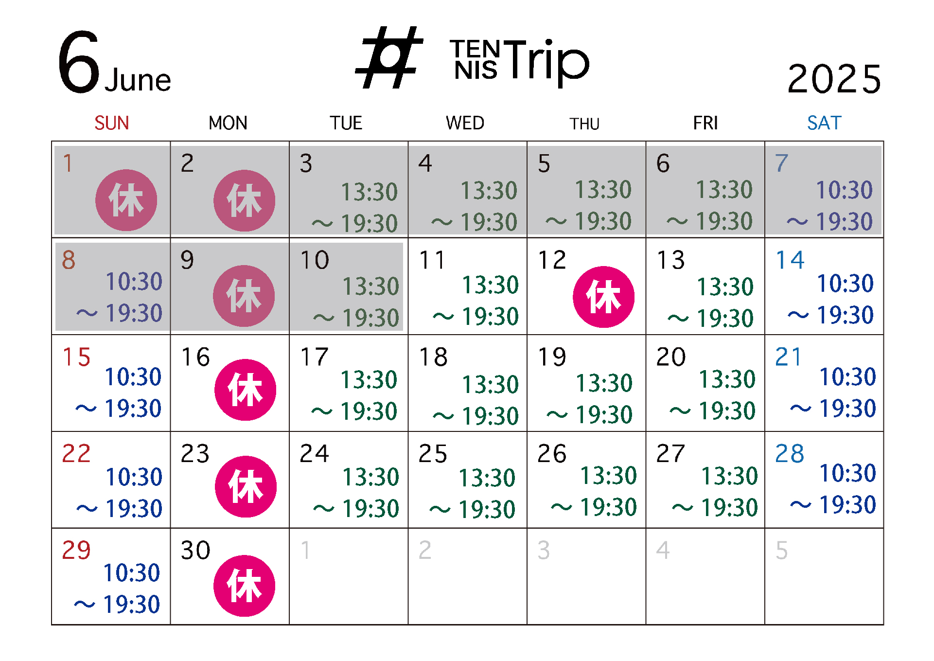 6/12(木):臨時休業【TENNIS Trip】BLOG 2025.06.116/12(木):臨時休業ご不便をお掛けいたしますが、何卒宜しくお願い致します。●JR総武線「下総中山駅」北口から徒歩2分【TENNIS Trip】[火〜金]13:30〜19:30[土日]10:30〜19:30[定休日]月曜日