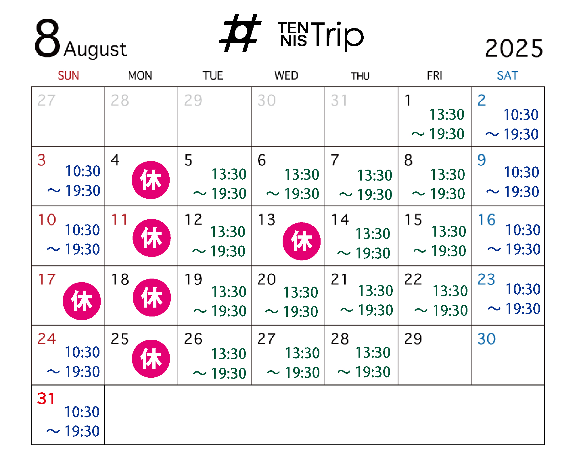 2025年8月:営業日・営業時間のお知らせ【TENNIS Trip】BLOG 2025.07.31【2025年8月営業日・営業時間】TENNIS Trip8/13(水)・8/17(日):臨時休業*変更時には、随時HP/SNSにてお知らせします。●JR総武線「下総中山駅」北口から徒歩2分【TENNIS Trip】[火〜金]13:30〜19:30[土日]10:30〜19:30[定休日]月曜日