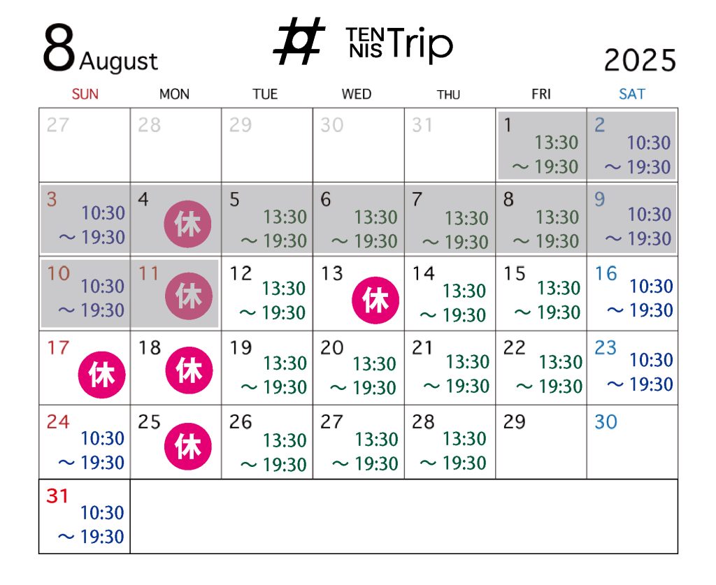 8/13(水):臨時休業【TENNIS Trip】BLOG 2025.08.128/13(水):臨時休業ご不便をお掛けいたしますが、何卒宜しくお願い致します。●JR総武線「下総中山駅」北口から徒歩2分【TENNIS Trip】[火〜金]13:30〜19:30[土日]10:30〜19:30[定休日]月曜日