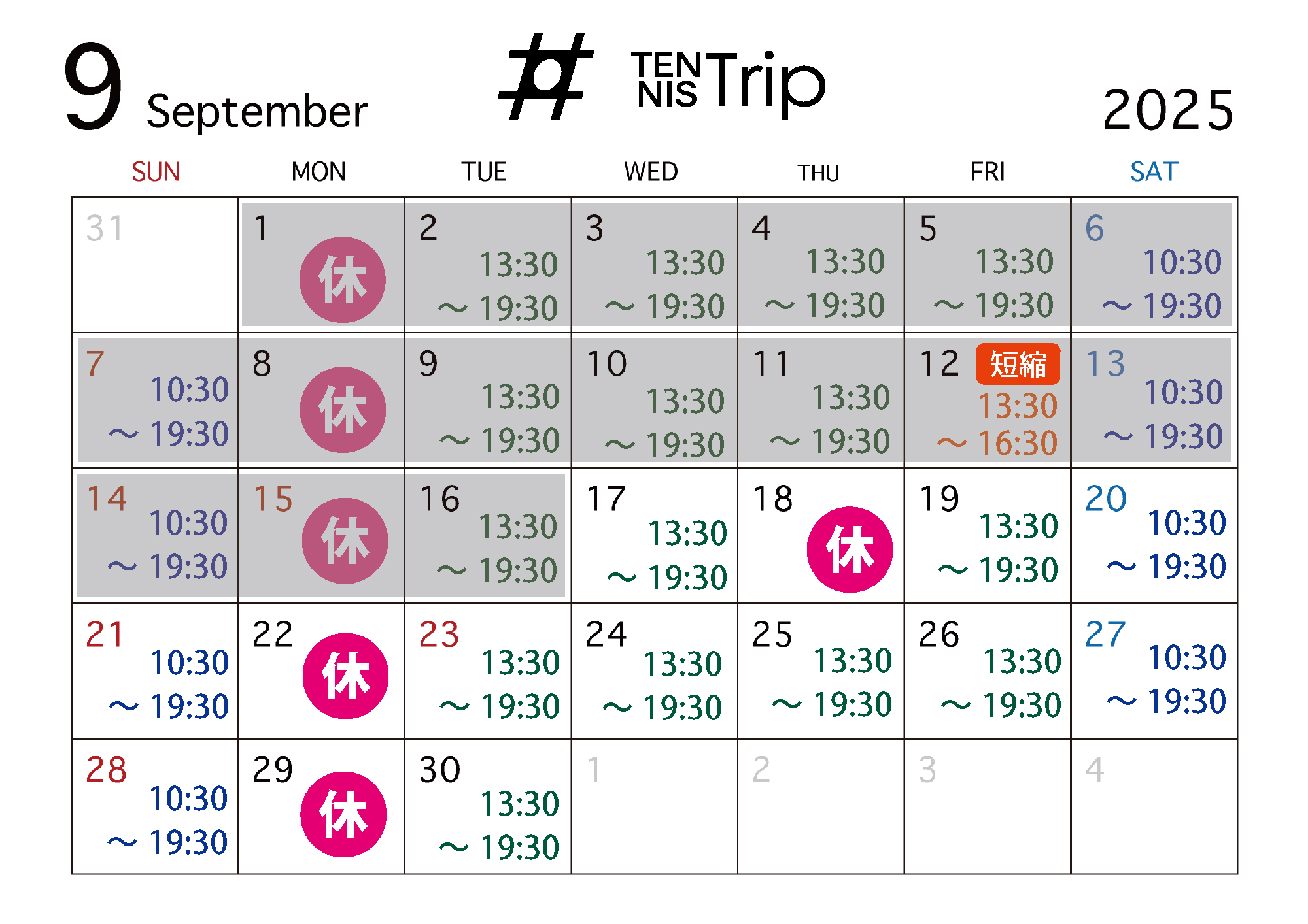 9/18(木):臨時休業【TENNIS Trip】BLOG 2025.09.179/18(木):臨時休業ご不便をお掛けいたしますが、何卒宜しくお願い致します。●JR総武線「下総中山駅」北口から徒歩2分【TENNIS Trip】[火〜金]13:30〜19:30[土日]10:30〜19:30[定休日]月曜日