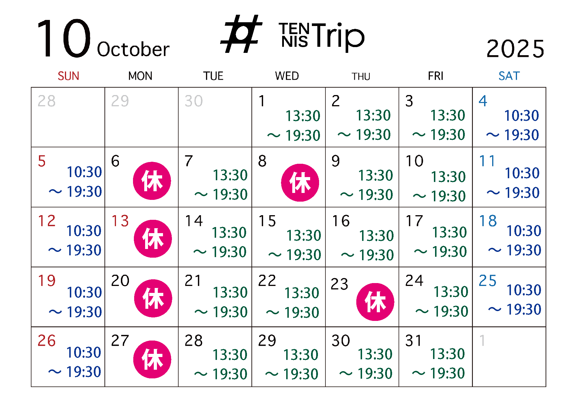 2025年10月:営業日・営業時間のお知らせ【TENNIS Trip】BLOG 2025.10.01【2025年10月営業日・営業時間】TENNIS Trip10/8(水)・10/23(木):臨時休業*変更時には、随時HP/SNSにてお知らせします。●JR総武線「下総中山駅」北口から徒歩2分【TENNIS Trip】[火〜金]13:30〜19:30[土日]10:30〜19:30[定休日]月曜日