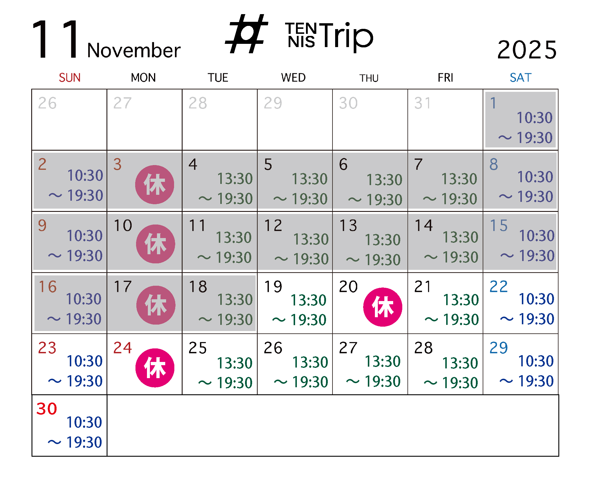 11/20(木):臨時休業【TENNIS Trip】BLOG 2025.11.1911/20(木):臨時休業ご不便をお掛けいたしますが、何卒宜しくお願い致します。●JR総武線「下総中山駅」北口から徒歩2分【TENNIS Trip】[火〜金]13:30〜19:30[土日]10:30〜19:30[定休日]月曜日