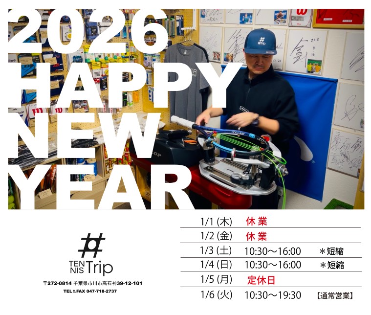新年明けましておめでとうございます!BLOG 2026.01.01新年明けましておめでとうございます!皆様のテニスライフを少しでもサポート出来るように努めて参りますので、2026年も宜しくお願い致します。●JR総武線「下総中山駅」北口から徒歩2分【TENNIS Trip】[火〜金]13:30〜19:30[土日]10:30〜19:30[定休日]月曜日