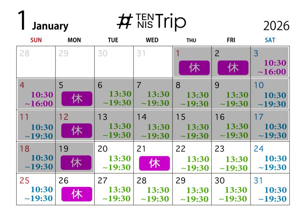 1/21(水):臨時休業【TENNIS Trip】BLOG 2026.01.201/21(水):臨時休業ご不便をお掛けいたしますが、何卒宜しくお願い致します。●JR総武線「下総中山駅」北口から徒歩2分【TENNIS Trip】[火〜金]13:30〜19:30[土日]10:30〜19:30[定休日]月曜日